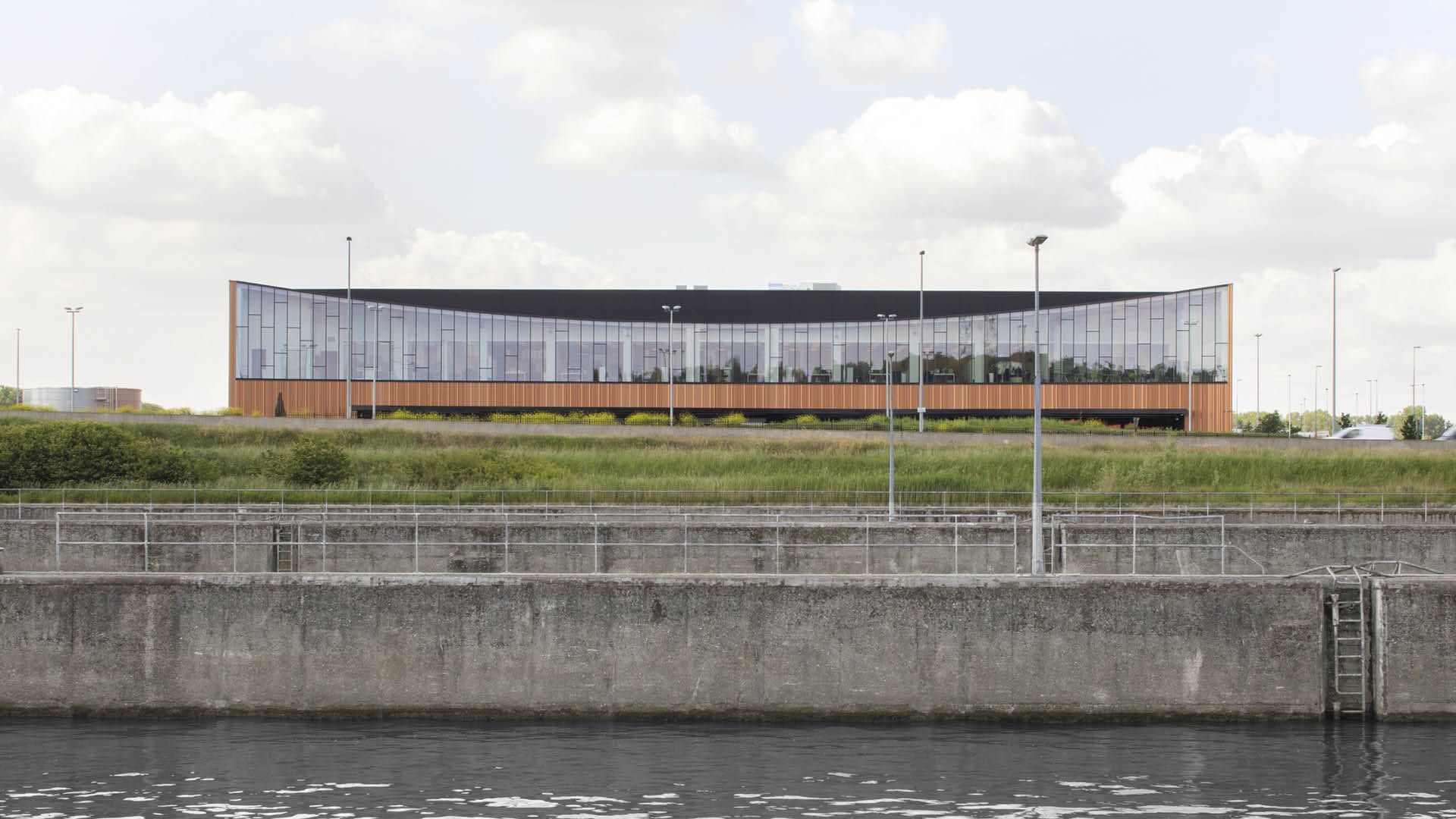L’acier dans la structure du bâtiment se limite ici aux poutrelles supportant le toit de la surface de bureaux, aux auvents et aux étançonnements des coupoles de toit.