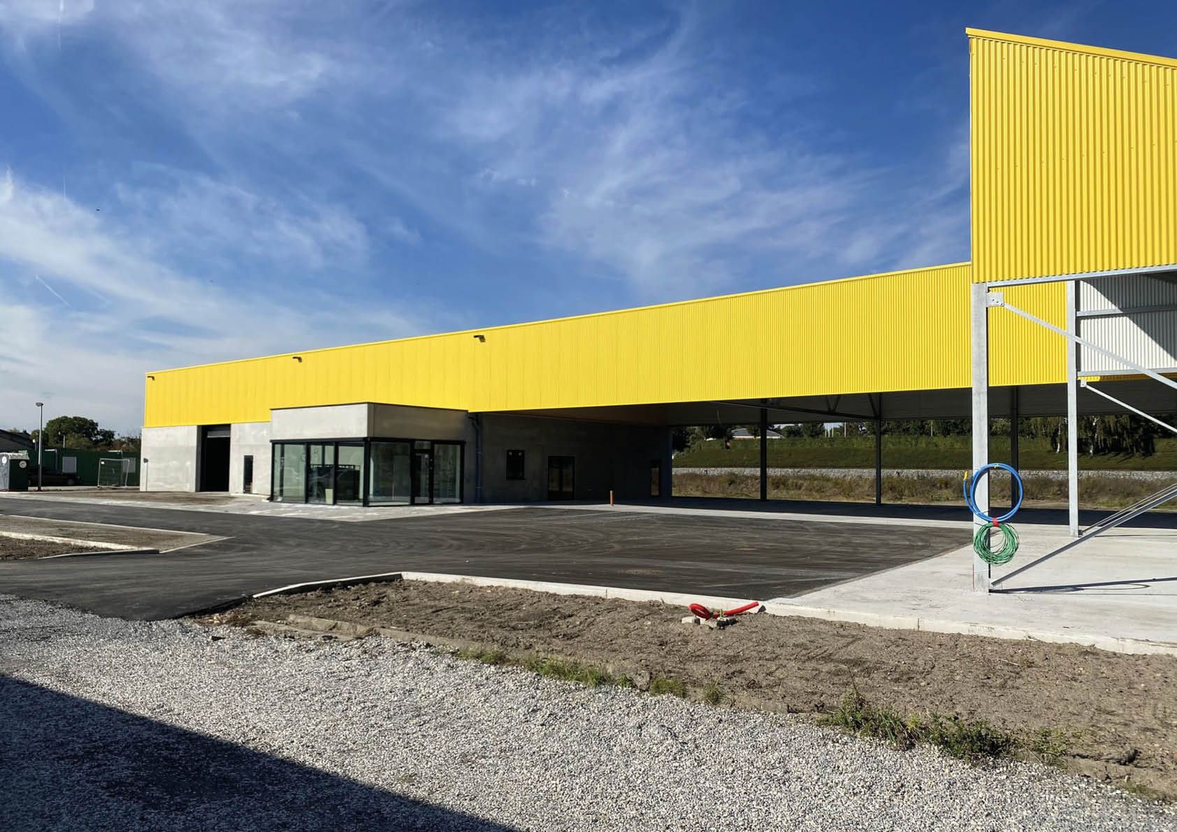 Le bâtiment se scinde en deux, avec le hangar d’un côté et l’auvent de l’autre.  Au fond de l’abri, une "plinthe" en panneaux de béton forme un bel ensemble avec les blocs de béton pour le stockage du sel de voirie. Le volume supérieur du bâtiment s’étend comme un auvent au-dessus du parking où seront garées toutes les voitures de l’entreprise. Les tôles d’acier profilées procurent au bâtiment un aspect frais et contemporain. Les cadres de fenêtres et les portails en aluminium noir complètent le logo noir et jaune de Kapelle-op-den-Bos.