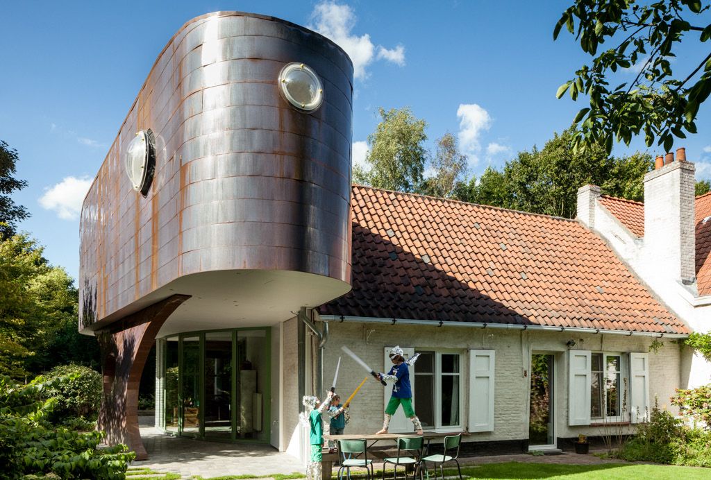 Pour conférer un caractère prononcé à cette extension, on a opté pour une sorte de capsule spatiale rétrofuturiste, avec un clin d’œil à la science-fiction. La structure portante est constituée d’acier, ce qui a permis de réaliser l’effet flottant de cette extension. Au-dessus et entre la structure en acier, une ossature en bois a été construite. Celle-ci a été revêtue de cuivre sur l’extérieur.