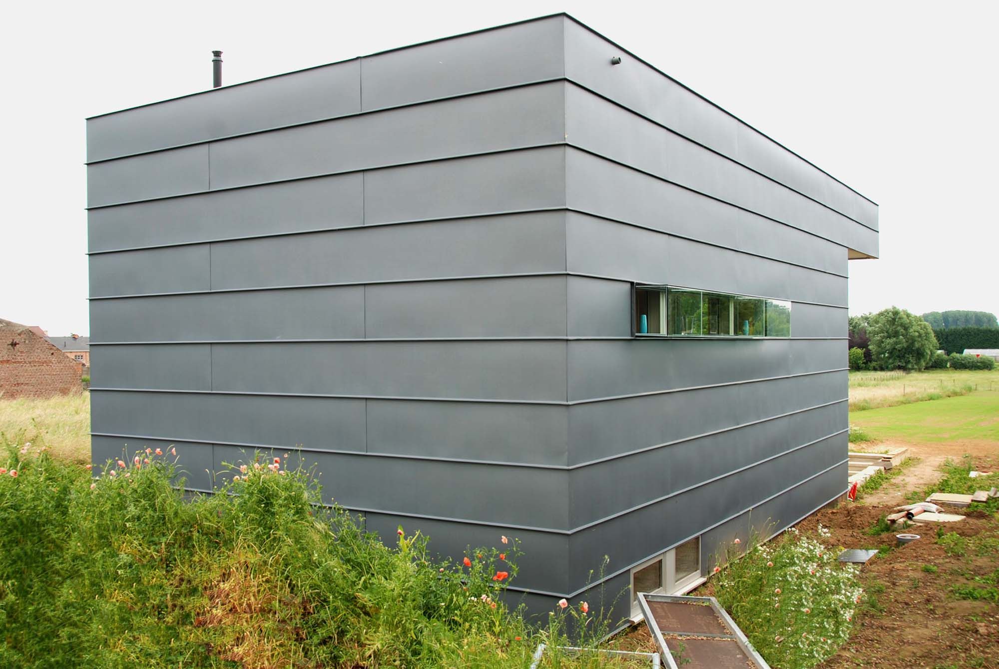 Les maîtres d’œuvre, passionnés de moteurs et fervents observateurs d’étoiles, avaient en matière d’habitat des souhaits simples, mais non dénués d’une certaine obstination. Ils désiraient une habitation à la fois petite et spacieuse avec des allures de loft. Une habitation compacte d’une surface ne dépassant pas les 100 m2, mais correspondant pleinement à leurs passions fut construite sur un squelette en acier. De leur bain à bulles, on peut contempler le ciel étoilé et de n’importe quel endroit de l’habitation, voir briller les bolides. Le jardin peut être observé à partir du lit et une terrasse couverte est intégrée dans le prolongement de la salle de séjour. La construction à ossature en acier utilise des poutres et des colonnes en acier, des planchers intermédiaires et une toiture en steeldeck, des panneaux sandwich Kingspan et du zinc. Le revêtement extérieur en zinc bleu, une primeur, irradie véritablement l’habitation.