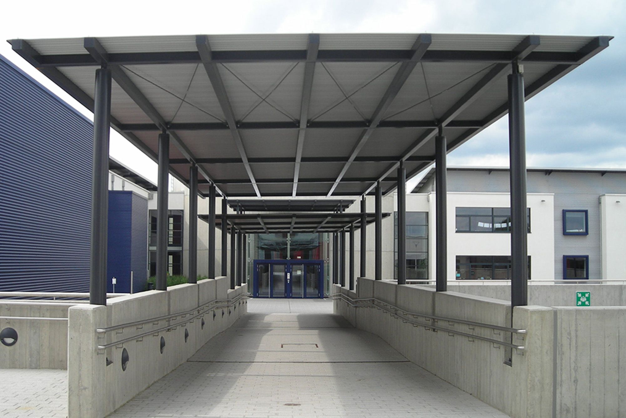 Pour ce projet qui comprend une école primaire, une école précoce, une structure d’accueil ainsi qu’un hall des sports, un ensemble d’auvents en acier a été réalisé dans la cour ainsi qu’au dessus de la rampe d’accès à l’école primaire. Ces structures légères et aérées combinent un système de poteaux de section ronde reliés par des traverses de section carrée et une ossature secondaire faite de tubes de section carrée supportant le bac de couverture. Une note de fantaisie est introduite par la disposition aléatoire des poteaux qui se prêtent parfaitement aux jeux d’enfants.