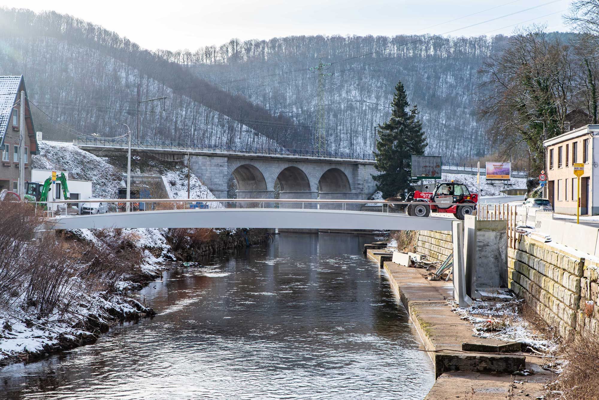 Les 2 anciens ouvrages, franchissant la Vesdre à Nasproué et La Raye à Verviers, fortement sinistré par les inondations de 2021, sont remplacés par des nouveaux ouvrages composés de 2 poutres en caisson trapézoïdal à hauteur variable. Le tablier central est une dalle en béton coulée sur prédalles d’une largeur utile de 4 m. Ces 2 ouvrages ont été réalisés dans un marché unique de par leur analogie de conception et de dimensions. Les quartiers desservis par ces ouvrages fortement enclavés nécessitaient un timing de chantier avec coupure du passage limité. La conception de ces ponts entièrement préfabriqués a permis de limiter la période de coupure entre la pose de l’ouvrage et la mise en service à moins d’un mois et demi. La structure en acier possède une portée principale de 21 m et 26 m respectivement, sans pile intermédiaire augmentant ainsi la section hydraulique de la rivière en cas de future crue, pour un poids de 32 et 40 tonnes environ. De plus, tous les impétrants ont été intégré dans le tablier et les caissons structurels d’un part pour une meilleure intégration esthétique de l’ouvrage et d’autre part pour protéger ces réseaux en cas de future crue.